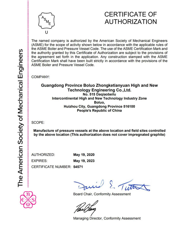中科天元全資子公司廣東省博羅中科天元高新技術工程有限公司(以下簡稱“博羅中科天元”)分別在2020年8月17日~18日進行了ASME許可(U鋼?。Q證復審工作、在2020年9月16日~18日進行了壓力容器制造(D級)及壓力管道安裝(GC2級)換證復審工作,并于近日獲得通過。