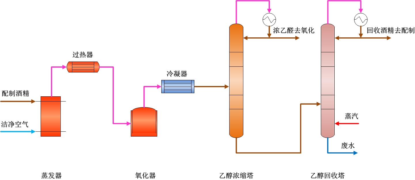 配制好的酒精送入蒸發(fā)器蒸發(fā),同時加入空氣,出蒸發(fā)器的氣相混合物經(jīng)過熱后進(jìn)入氧化器,在催化銀的作用下,乙醇轉(zhuǎn)化為乙醛,乙醛冷凝后進(jìn)入乙醛濃縮塔,濃縮后的濃乙醛去乙醛氧化工序使用,未反應(yīng)的乙醇通過回收塔回收返回乙醇配制間。