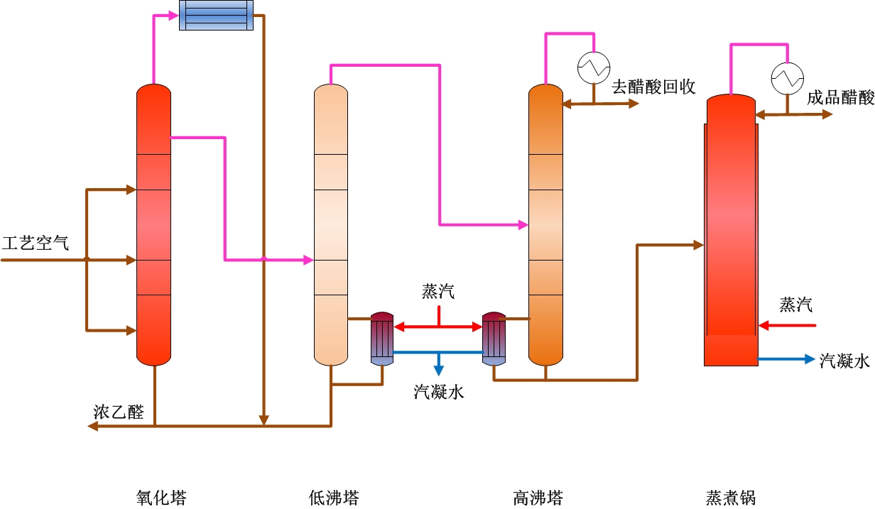 濃乙醛自塔底送入氧化塔,同時加入醋酸錳,氧化塔分為五段,每段均通入空氣,在氧化塔內(nèi),乙醛被氧化成醋酸,塔頂未反應(yīng)氣體進(jìn)冷凝器,冷凝液回氧化塔底,不凝氣排放,粗醋酸送入低沸器。在低沸塔內(nèi),醋酸錳被分離下來,送回氧化塔,塔頂醋酸蒸汽自塔中部進(jìn)入高沸塔。乙酸甲酯等低沸物在高沸塔內(nèi)上升至塔頂,冷凝后部分采出的稀酸送入蒸發(fā)鍋。在蒸發(fā)鍋內(nèi),醋酸被蒸發(fā)自塔頂,冷凝、冷卻后即得到成品醋酸,塔釜少量高沸物定期清理。