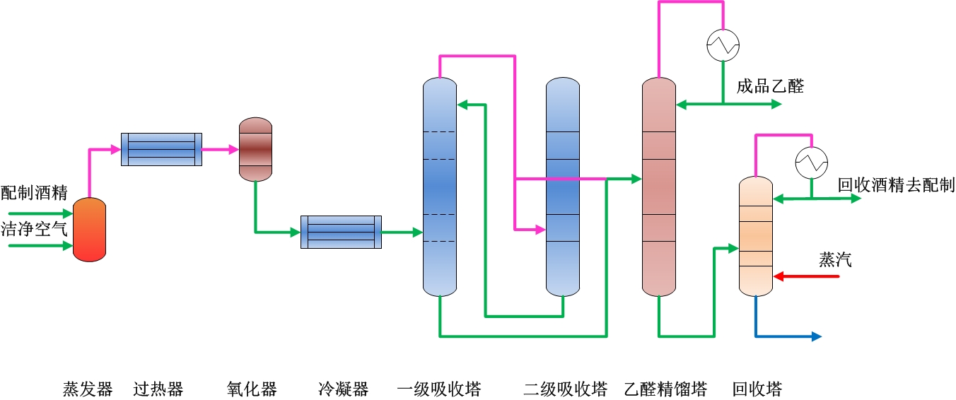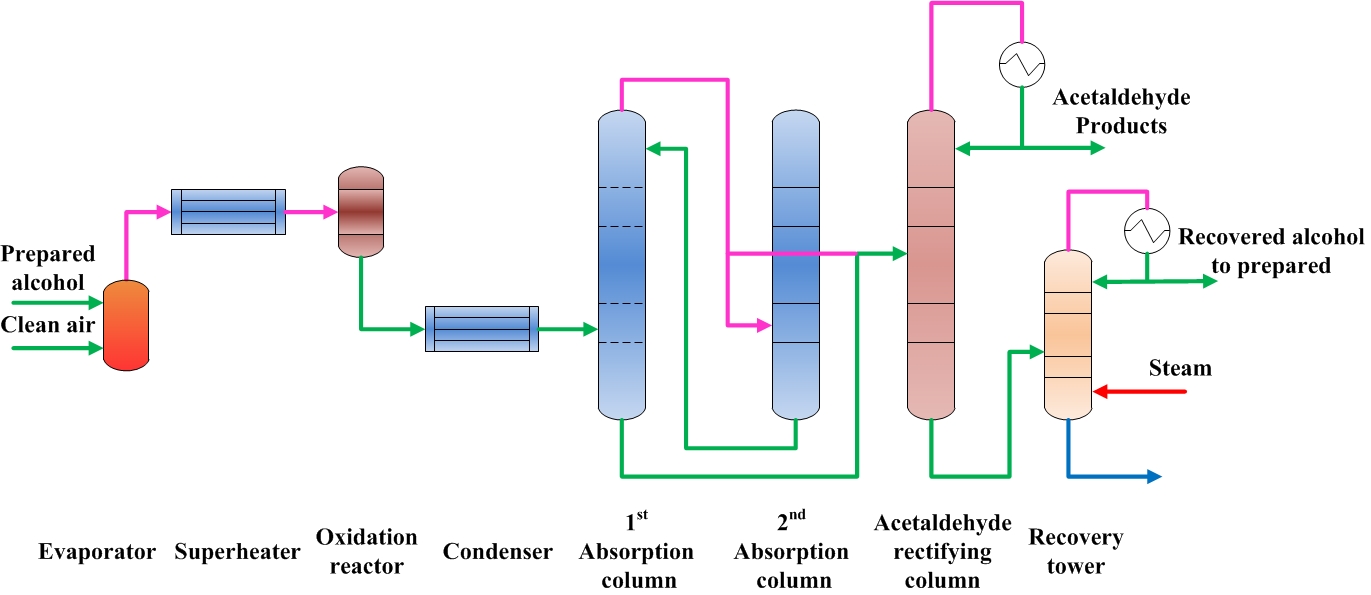 配制好的酒精送入蒸發(fā)器蒸發(fā),同時(shí)加入空氣,蒸發(fā)器出來(lái)的混合氣體經(jīng)過(guò)熱后進(jìn)入氧化器,在催化劑作用下,乙醇轉(zhuǎn)化為乙醛,反應(yīng)氣體冷凝后再經(jīng)過(guò)第一吸收塔和第二吸收塔組成的系統(tǒng)得到稀乙醛。稀乙醛經(jīng)預(yù)熱后進(jìn)入乙醛精餾塔中部,塔頂醛汽經(jīng)冷卻后一部分回流,一部分成為成品乙醛。未反應(yīng)的乙醇通過(guò)回收塔回收返回乙醇配制槽。